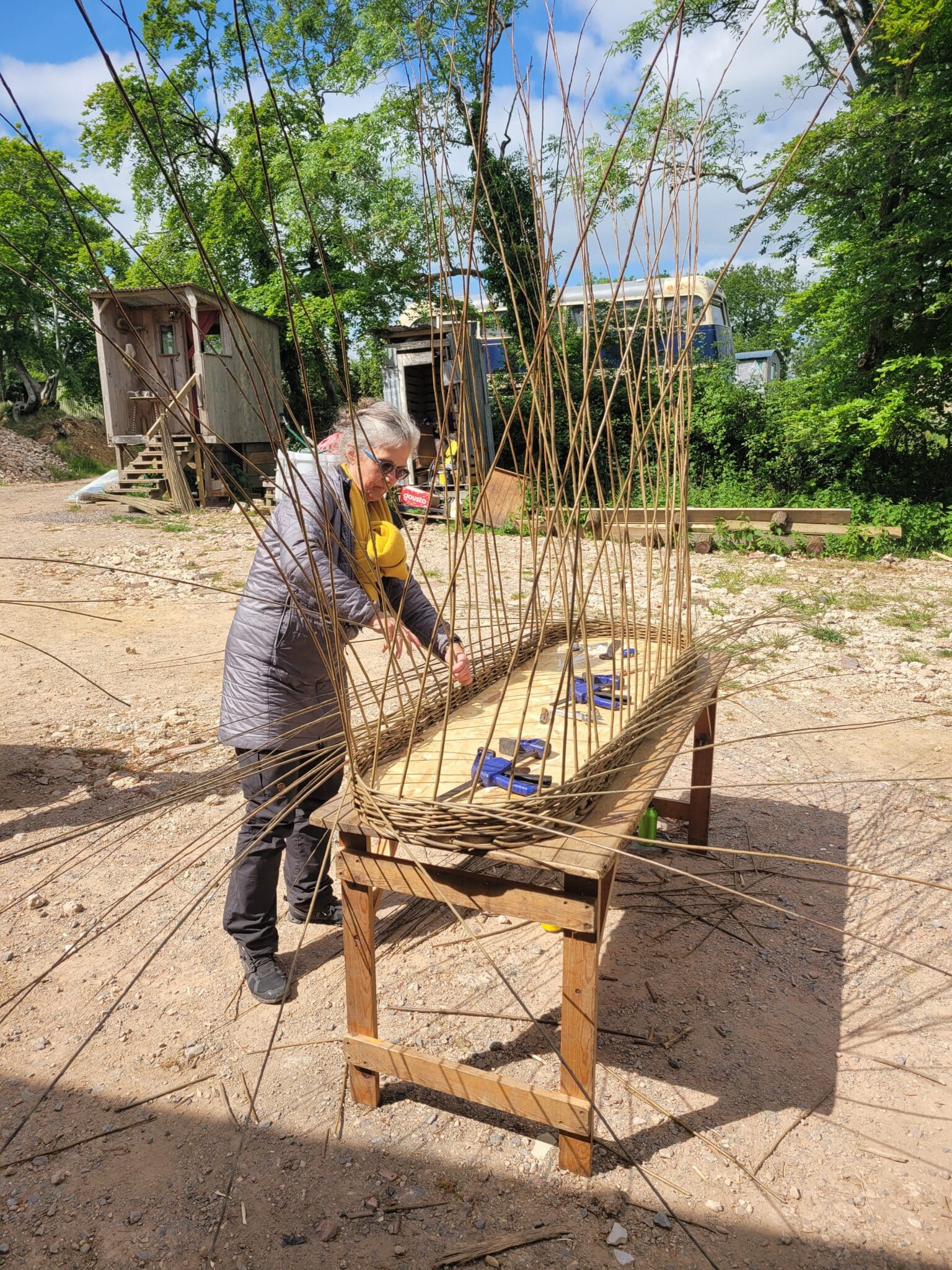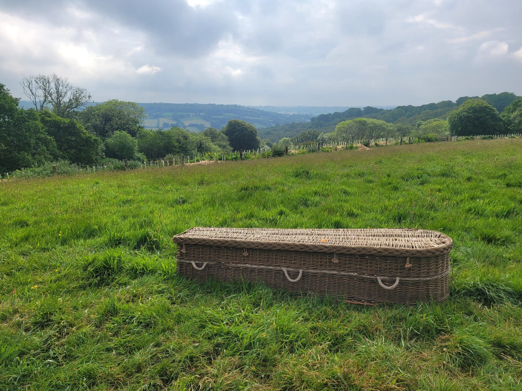Ende Mai fuhr ich mit dem Zug nach Südwestengland. Ich hatte mich zu einem 5-tägigen Kurs angemeldet, um einen Weide-Sarg zu flechten. Sophia, die Eigentümerin von Woven Farewell, ist eine sehr einfühlsame Lehrerin, die sich auf die Herstellung handgewebter Särge und Urnen spezialisiert hat. Ihre Werkstatt liegt idyllisch auf einem Bauernhof in Devon, umgeben von saftigen Wiesen, sanften Hügeln und Schafherden. Gemeinsam mit drei anderen Frauen verbrachte ich die Woche, um den Sarg zu weben. Wir campten in unseren Autos, aßen zusammen, webten und halfen uns gegenseitig. Die Särge nahmen immer mehr Gestalt an und auch die neuen Freundschaften wurden Strang für Strang gefestigt.